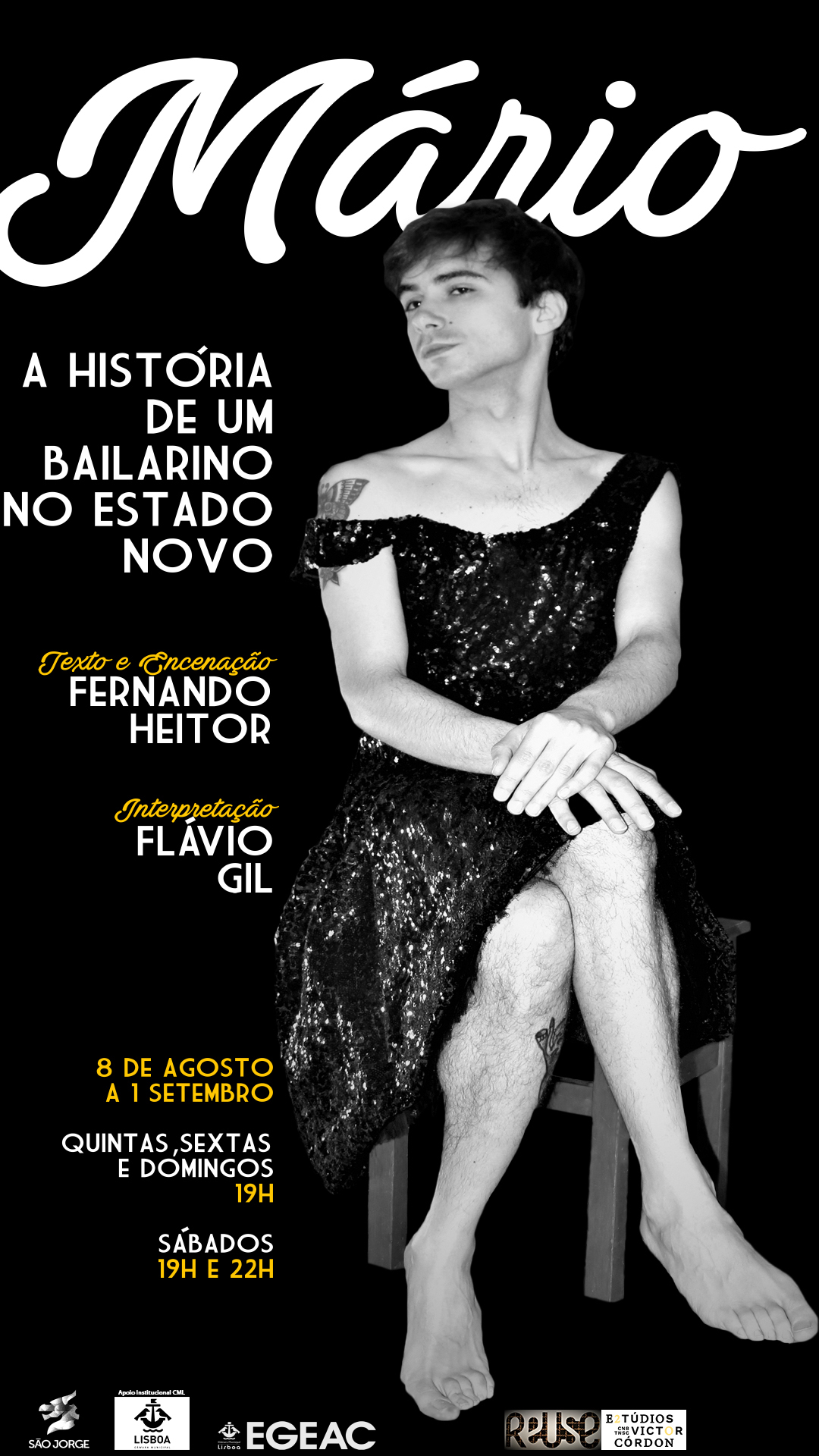 Mário – a história de um bailarino no Estado Novo, da autoria e encenação de Fernando Heitor e com interpretação de Flávio Gil. O espectáculo vai estar em cena na sala 2 do Cinema São Jorge em Lisboa, de 8 de Agosto a 1 de Setembro, com 5 sessões por semana: quintas, sextas e domingos às 19h00 e sábados (2 sessões) 19h00 e 22h00.