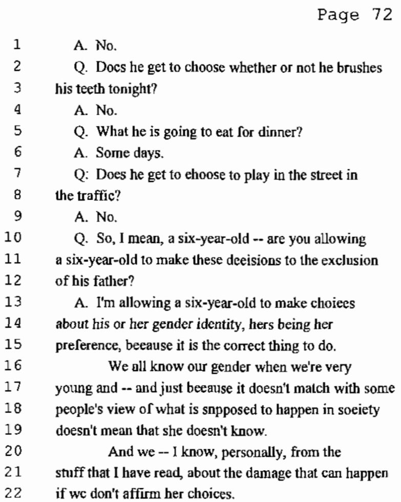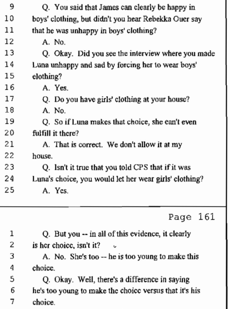 Acusou igualmente a mãe de querer fazer tratamentos hormonais e operações a Luna que a tornariam estéril. Como foi dito anteriormente, há muitos passos que podem ser dados no processo de vida de uma criança trans. Estes devem ser equacionados na devida altura e com o acompanhamento de pessoal especializado de forma a permitir uma vida saudável às crianças transgénero. As acusações que o pai de Luna fez não têm especial sentido numa criança de sete anos, porque essas decisões só serão questionadas a seu devido tempo e as definitivas em idade adulta. Não cabe, portanto, nem ao pai – nem à mãe – tomá-las, mas sim caberá um dia à Luna.