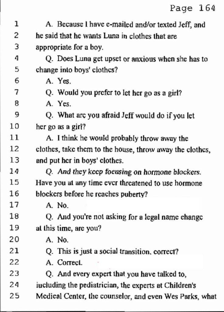 Jeffrey, com ajuda da Igreja, lançou uma brutal campanha de difamação à mãe e de angariação de fundos para “salvar o seu filho“. Acusou Anne de forçar a criança a vestir-se de menina quando, na realidade – e como foi testemunhado em tribunal e confirmado por Luna – a mãe nunca limitou a escolha de Luna no que toca à forma de se vestir, tendo roupa para menino e para menina em casa, a escolha, lá está, era – e é – a de Luna. Já Jeffrey, que disse que Luna preferia vestir roupas de menino em sua casa, não lhe deu outra escolha senão essa, dado que não possuía roupas de menina na sua própria casa. Luna, portanto, não tinha outra hipótese senão vestir roupas de menino quando ia visitar o pai. Esta é uma realidade que apenas espelha a interação entre pai e filha: o desconforto e o receio sentido por ambas as partes, tendo sido entendido em tribunal que a Luna cedia aos pedidos do pai, uma figura autoritária, para não haver conflito. No entanto, é sabido o quão nefasto pode ser este tipo de atitudes na saúde mental de uma criança trans, algo que Jeffrey não reconhece.