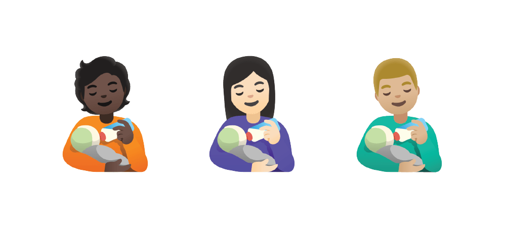 Até agora, o único emoji que descreve cuidados infantis é o emoji de “amamentação”. Como a incapacidade de amamentar não impede uma mãe ou um pai de nutrir a sua criança, a equipa da Google propôs um emoji com pessoas a alimentar uma criança com um biberão, um emoji que todas as pessoas podem usar e identificar-se.