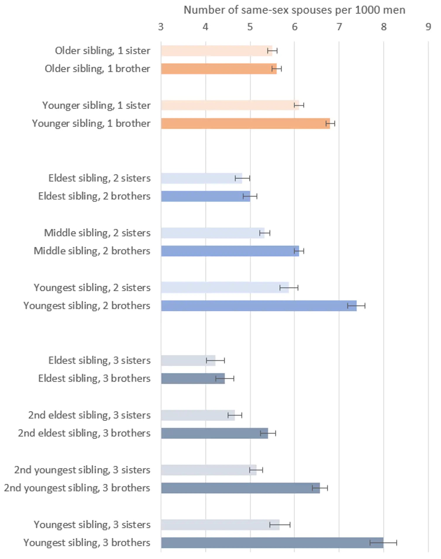 O gráfico abaixo ilustra alguns de nossos achados, mostrando o número de homens que entraram em uniões do mesmo sexo entre aqueles com até três irmãos. O sexo dos irmãos mais velhos exerce uma influência considerável sobre a formação da união entre pessoas do mesmo sexo. Por outro lado, o sexo dos irmãos mais novos desempenha pouco ou nenhum papel.